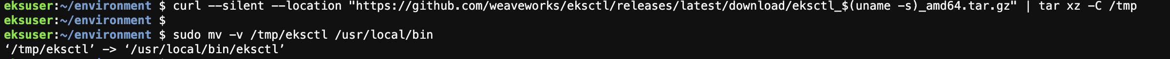 $ curl --silent --location "https://github.com/weaveworks/eksctl/releases/latest/download/eksctl_$(uname -s)_amd64.tar.gz" | tar xz -C /tmp sudo mv -v /tmp/eksctl /usr/local/bin