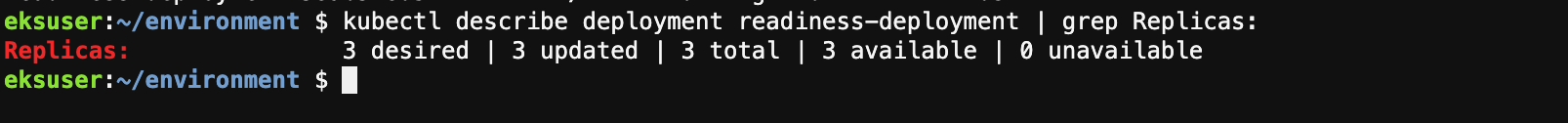 $ kubectl describe deployment readiness-deployment | grep Replicas: