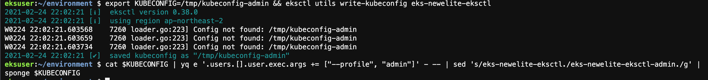 export KUBECONFIG=/tmp/kubeconfig-admin && eksctl utils write-kubeconfig eks-newelite-eksctl