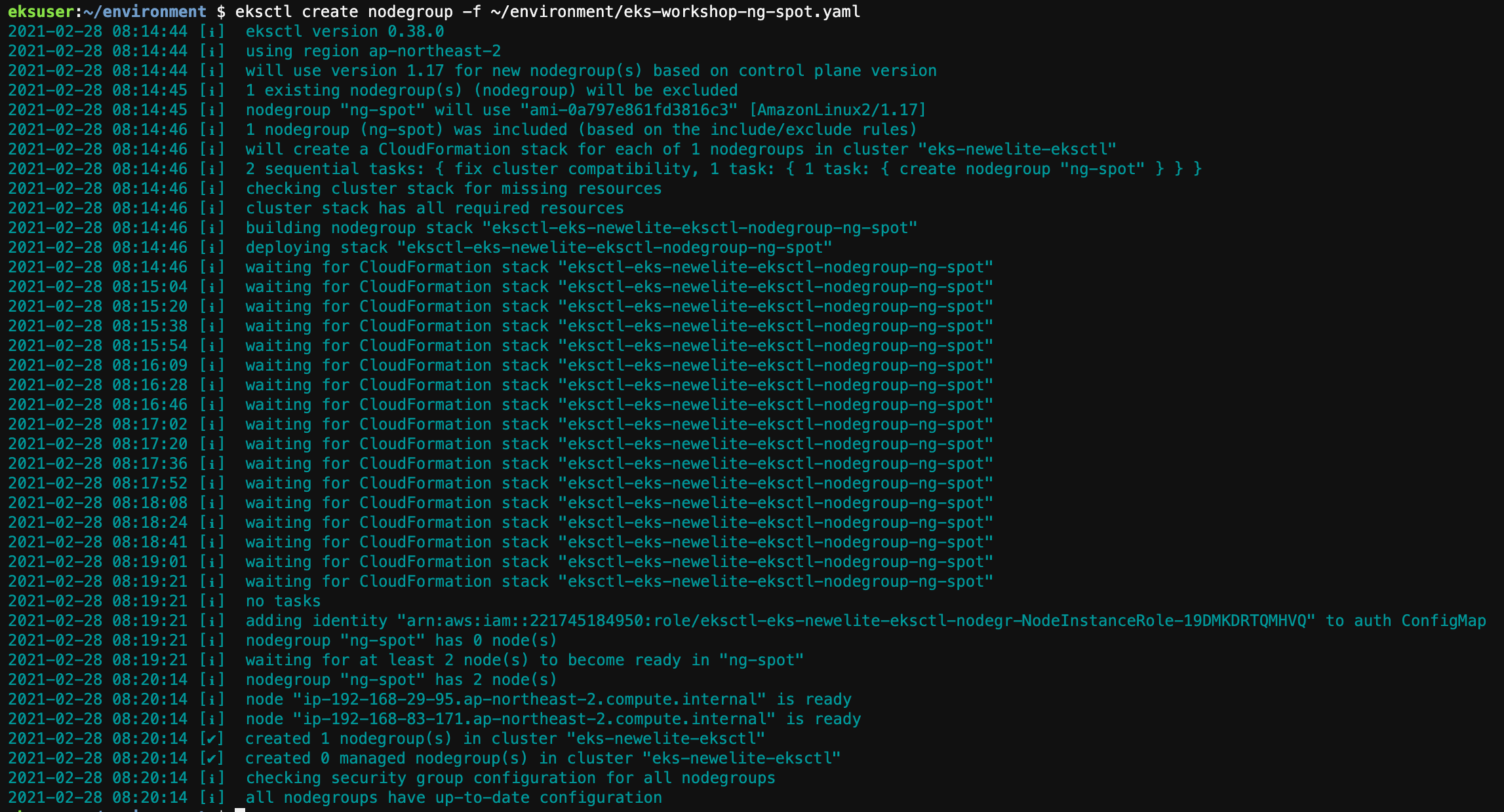 eksctl create nodegroup -f ~/environment/eks-workshop-ng-spot.yaml