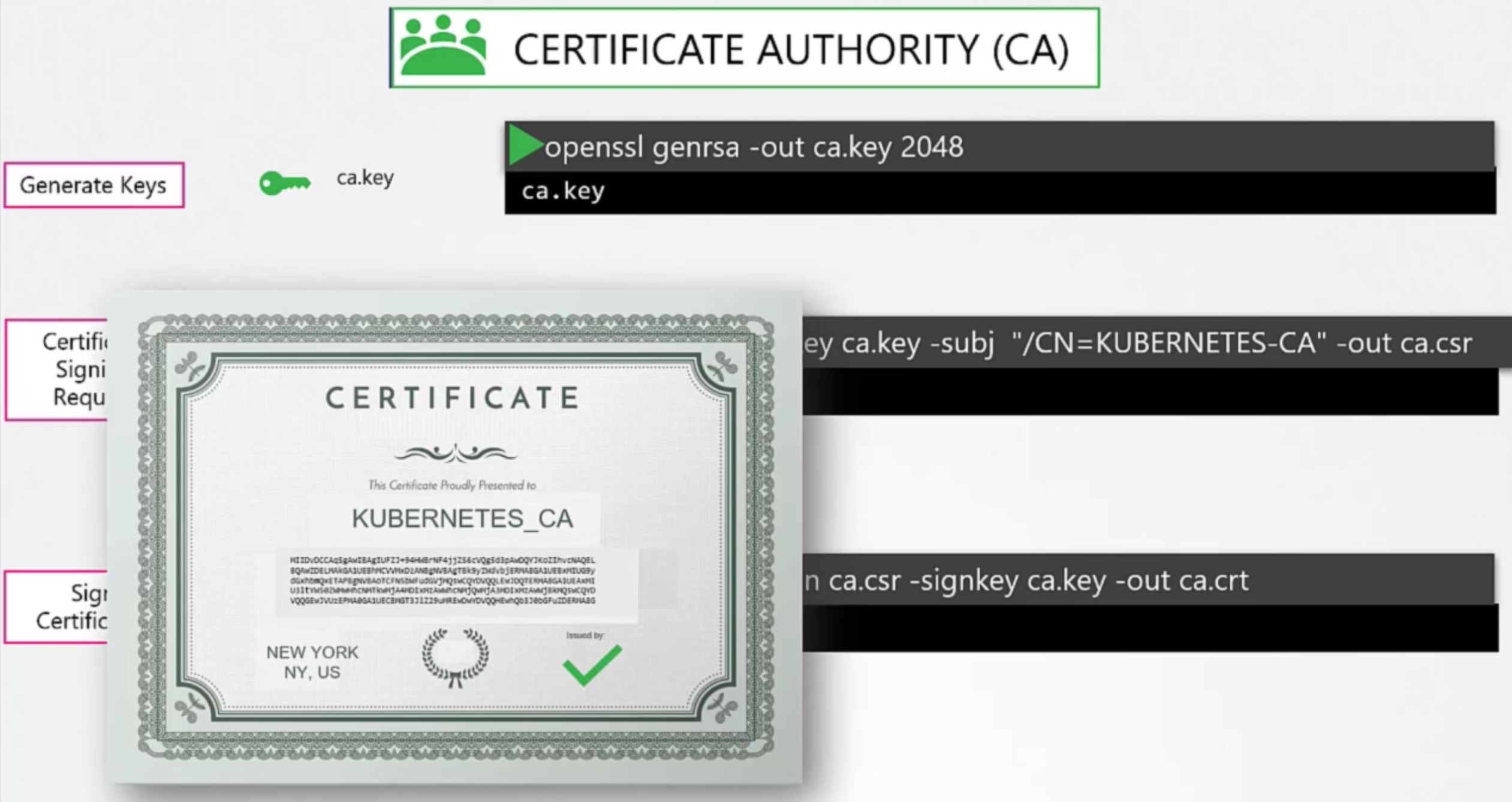 $ openssl req -new -key ca.key -subj "/CN=KUBERNETES-CA" -out ca.csr