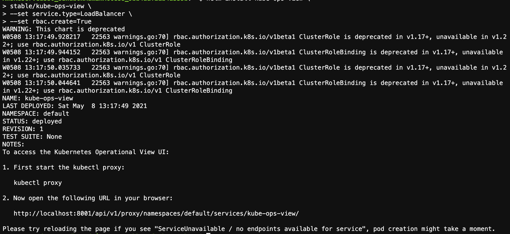 kube-ops-view default 1 2021-05-08 13:17:49.748452585 +0000 UTC deployed kube-ops-view-1.2.4 20.4.0