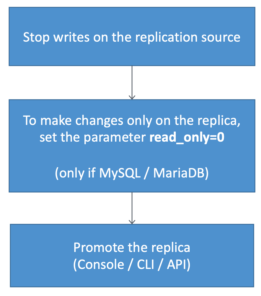 - For MySQL / MariaDB read replica, set the parameter read_only = 0 for the read replica to make it writable