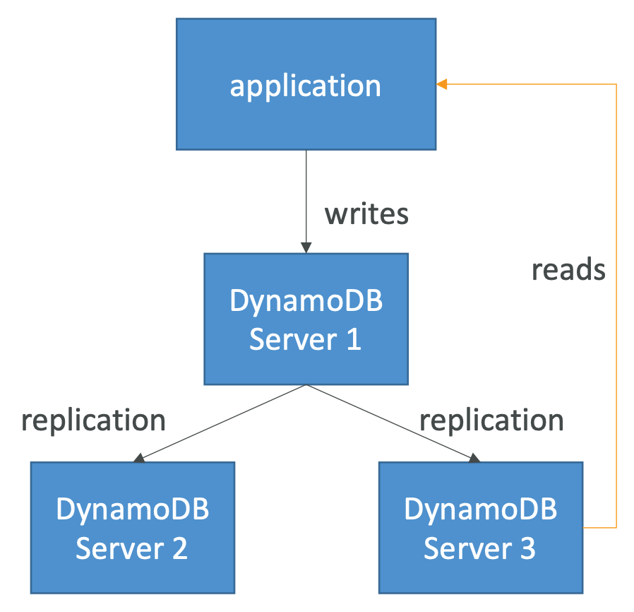 - 최종 일관된 읽기(Eventually Consistent Read): 쓰기 직후에 읽는 경우 복제로 인해 예기치 않은 응답을 받을 수 있음