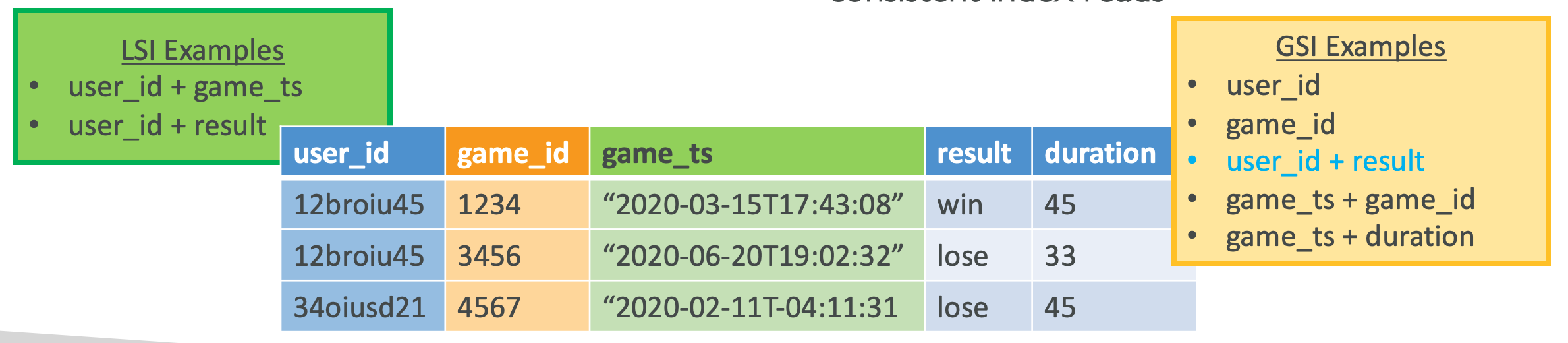 - 테이블의 기본 인덱스와 같거나 다른 파티션/해쉬 키를 갖을 수 있음