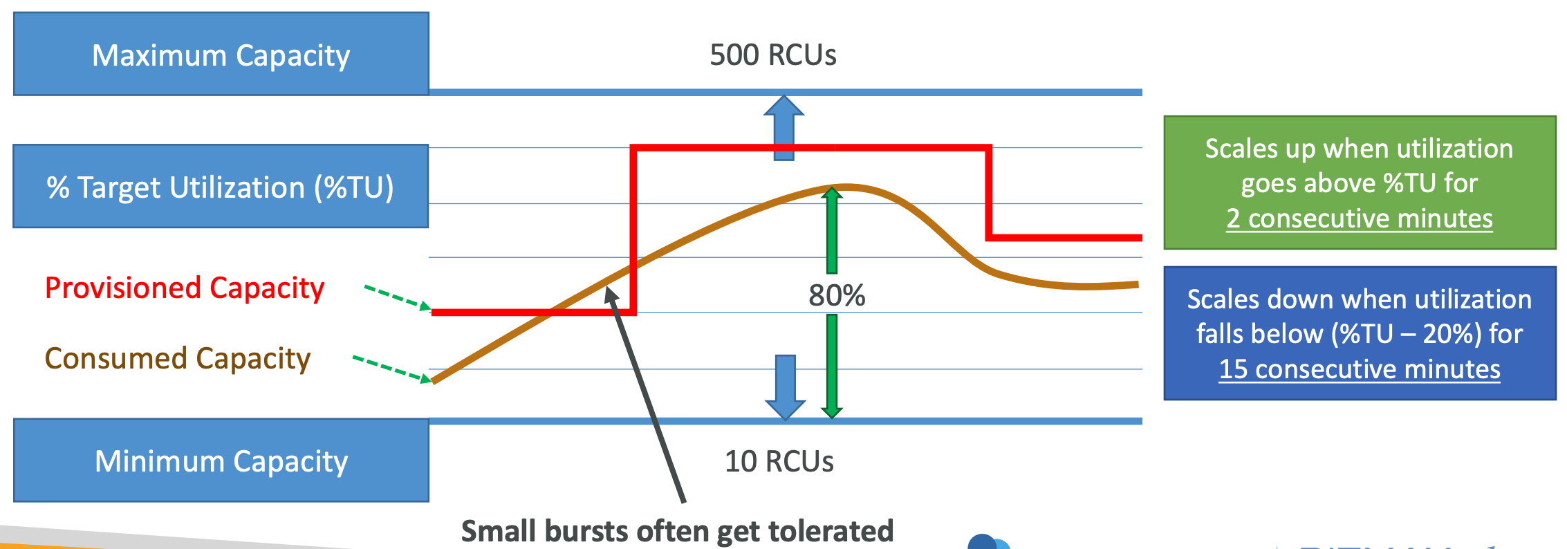 - You set the desired target utilization, minimum and maximum provisioned capacity