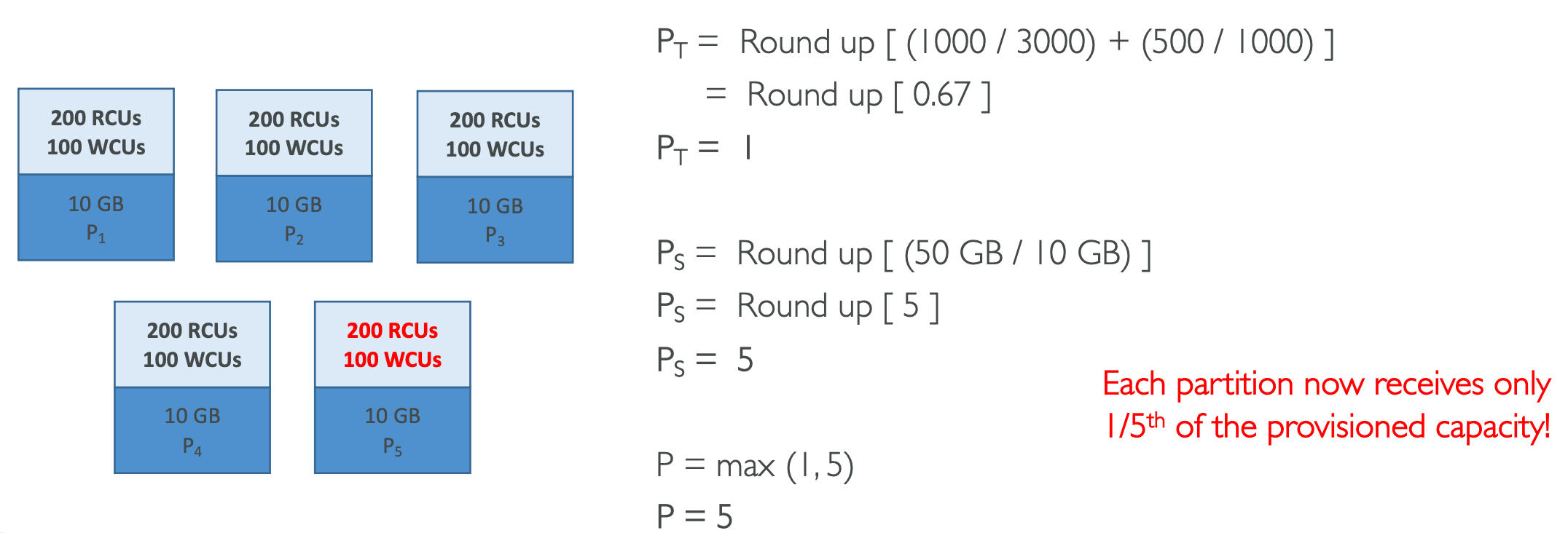 - 1 Partition = 1000 WCUs or 3000 RCUs (Maximum supported throughput per partition)