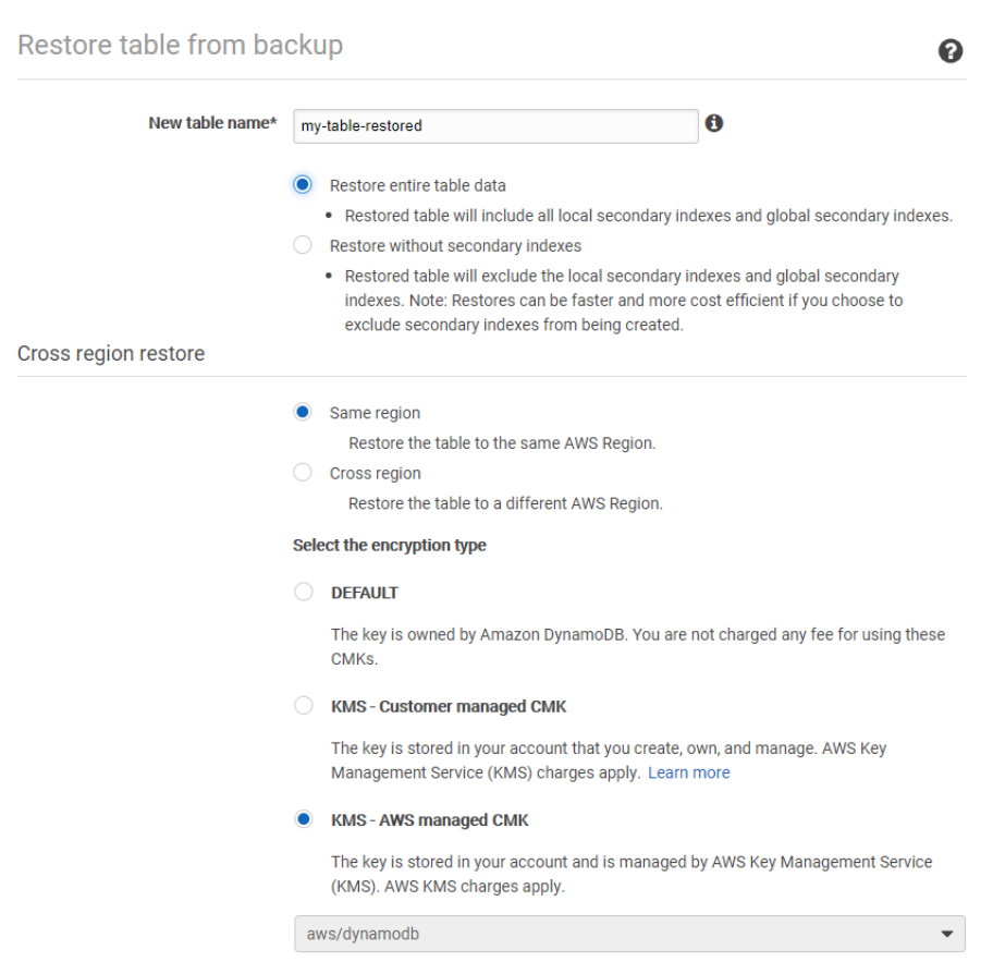 - Restored table gets the same provisioned RCUs/WCUs as the source table, as recorded at the time of backup