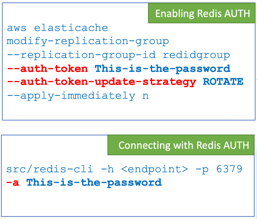 - Redis AUTH - server can authenticate the clients (requires SSL/TLS enabled)
