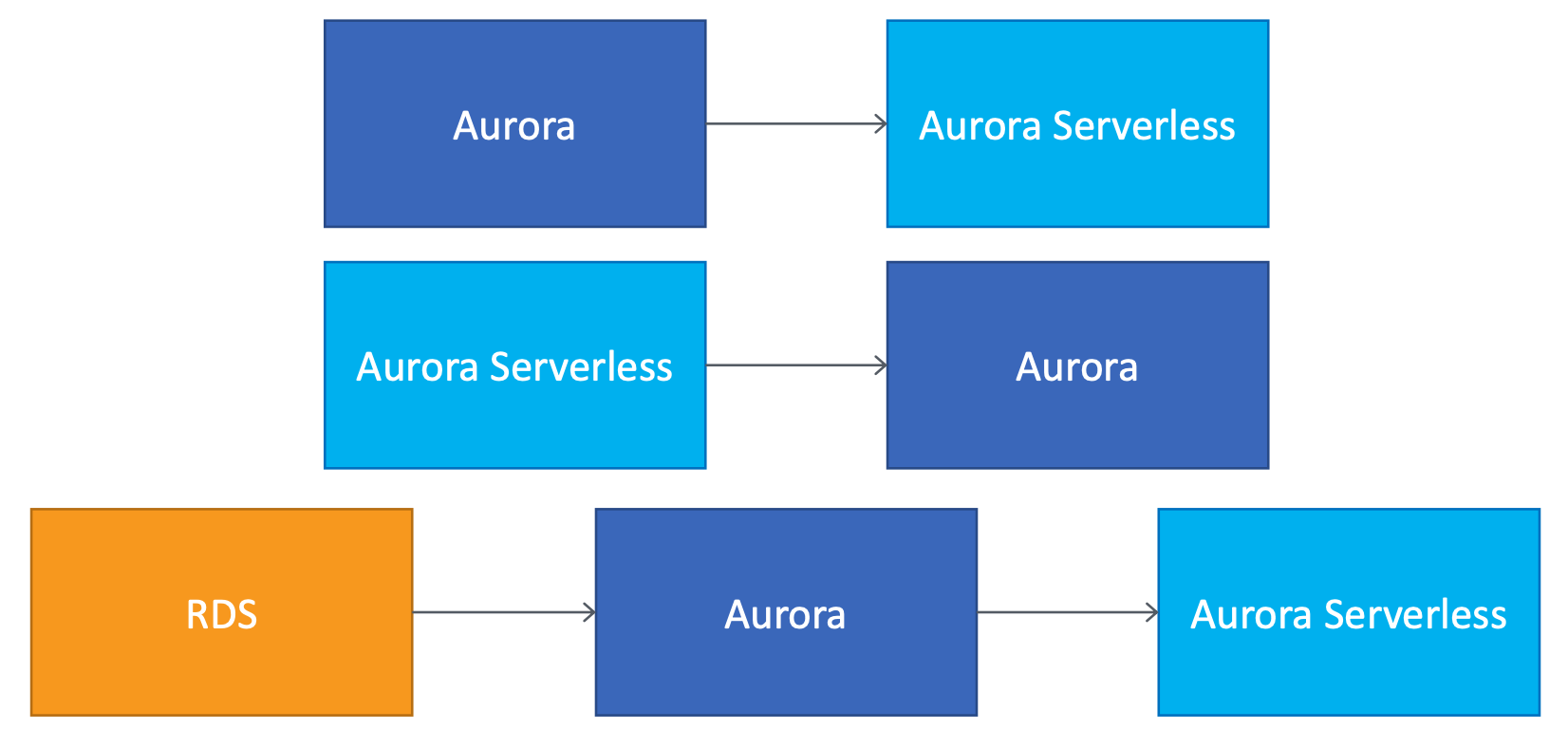 - Can migrate between Aurora provisioned cluster and Aurora Serverless cluster