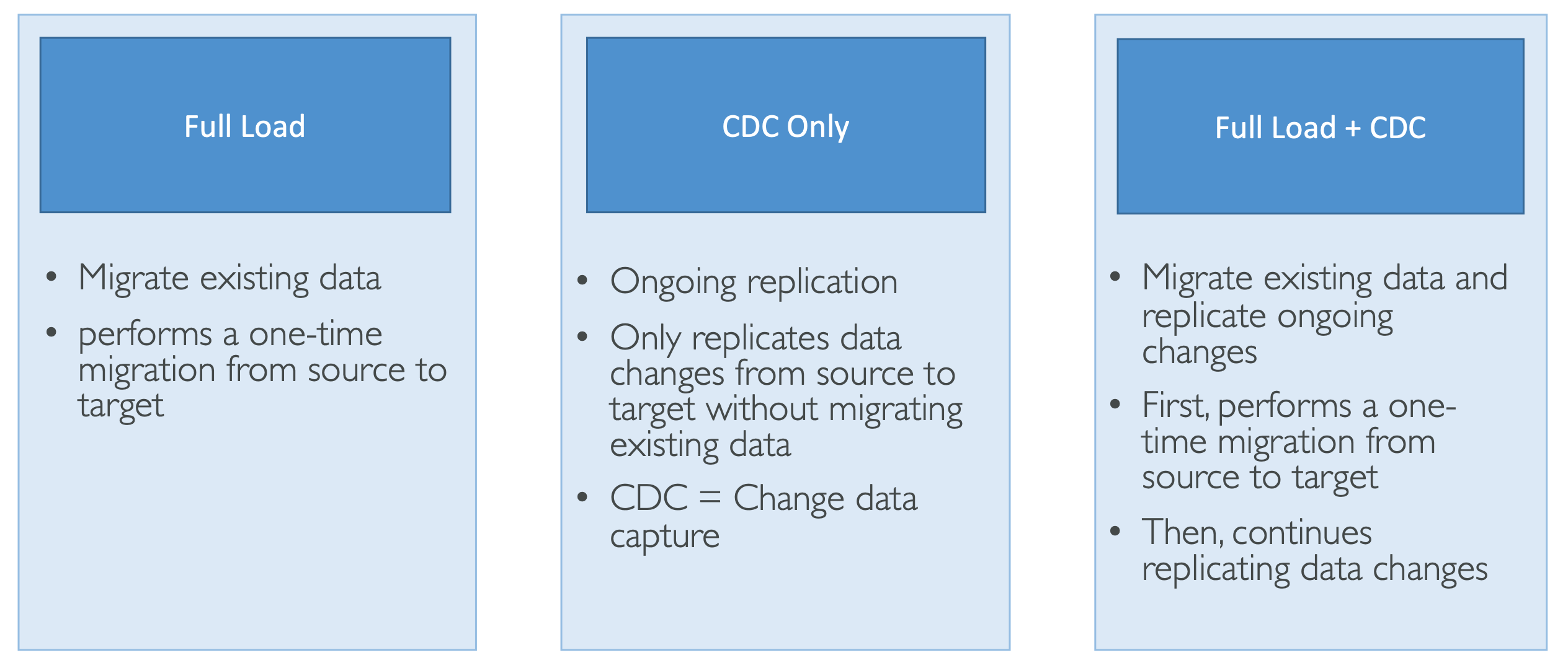 - Migration type - full load, CDC, or both