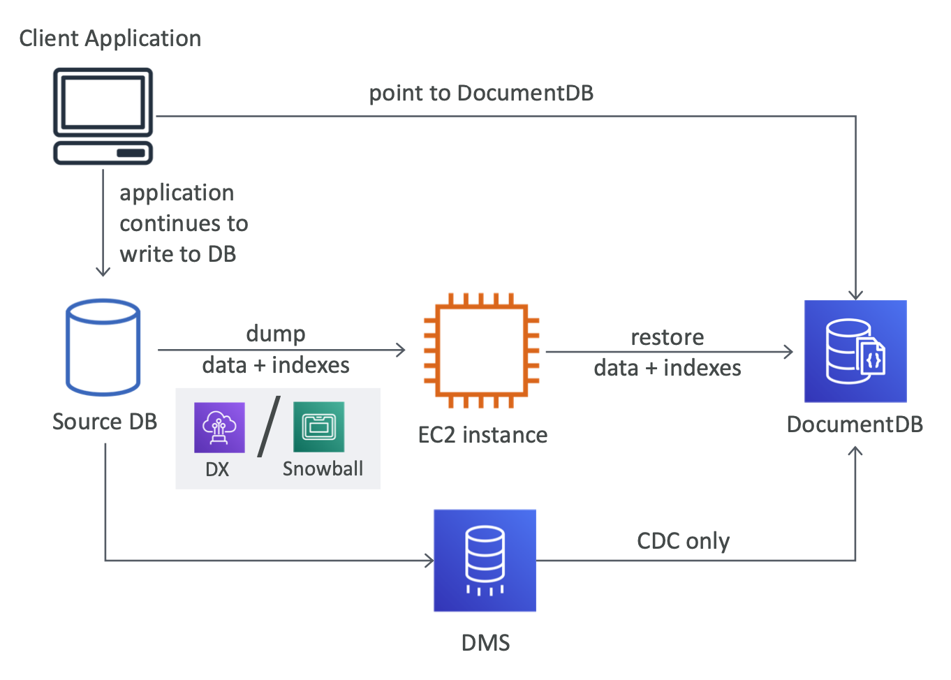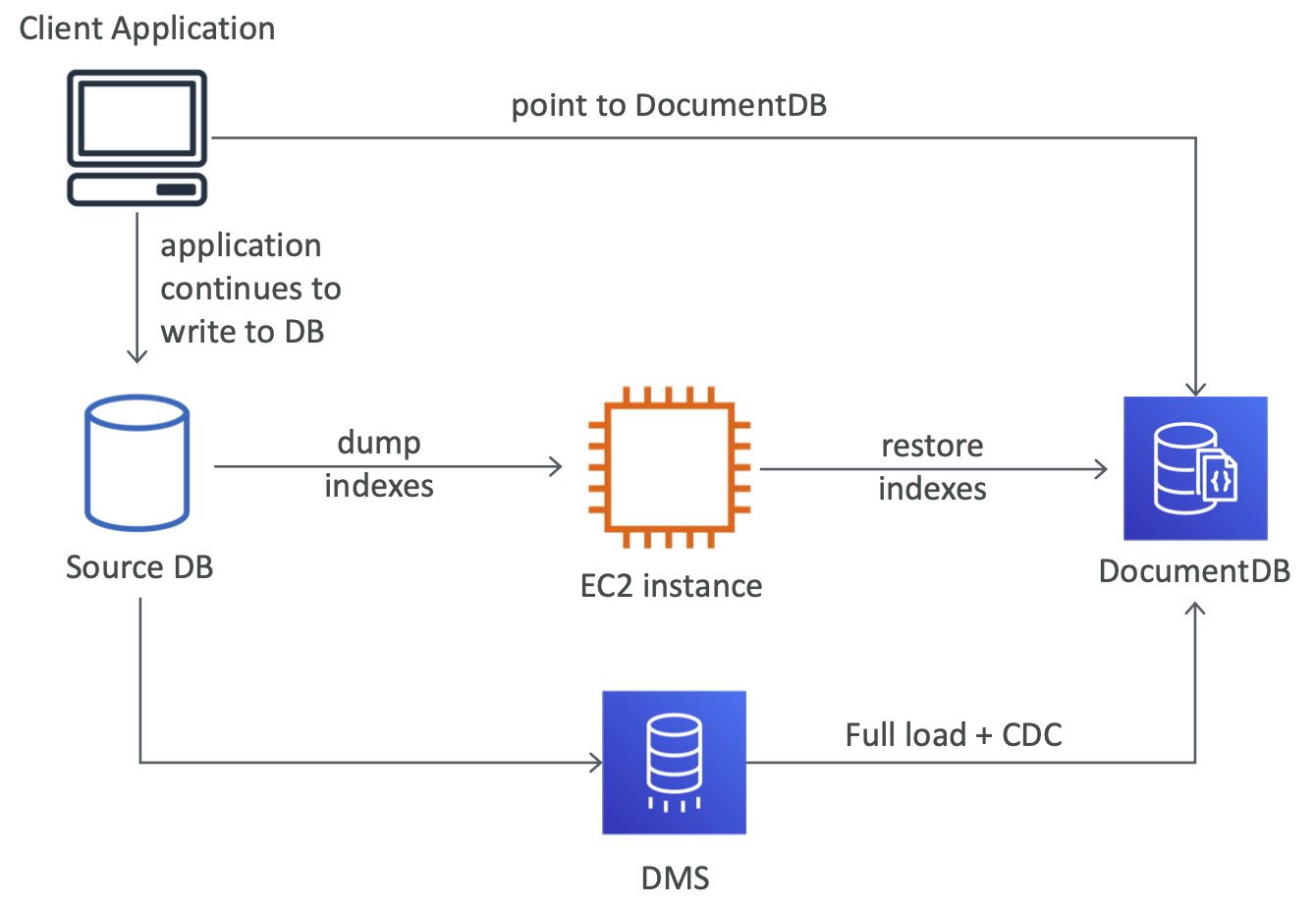 - Full load + CDC using DMS