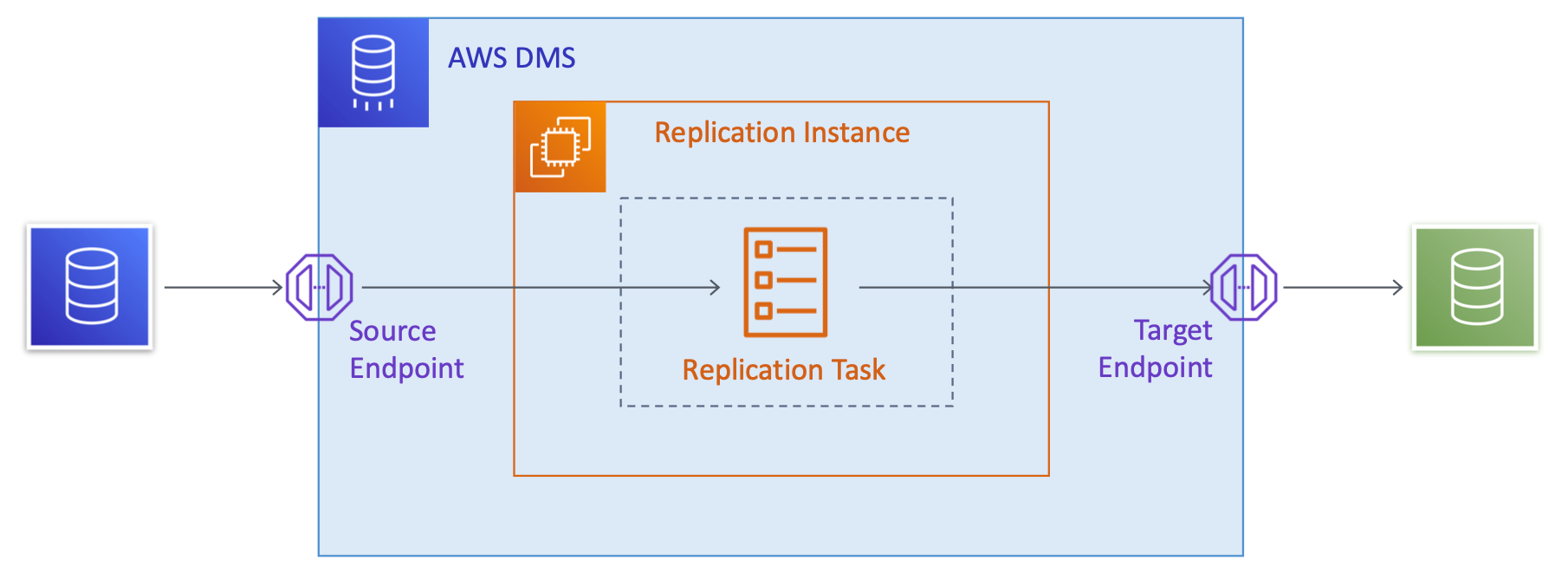 - Replication task specifies actual data talbes to migrate and data transformation rules