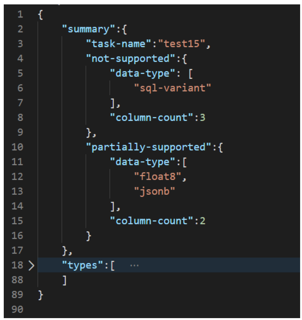 - Includes JSON output containing summary and details of unsupported data types