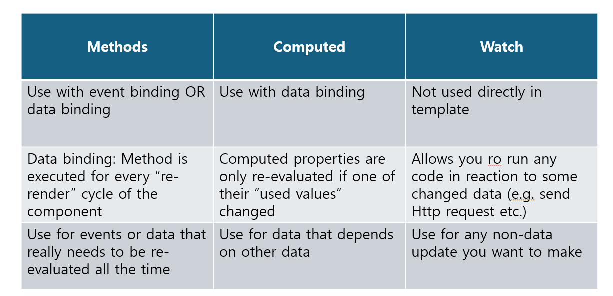 | Data binding: Method is executed for every “re-render” cycle of the component | Computed properties are only re-evaluated if one of their “used values” changed | Allows you ro run any code in reaction to some changed data (e.g. send Http request etc.) |
