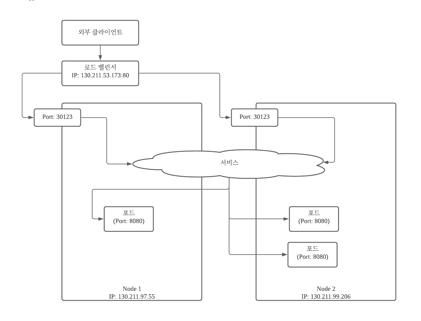 - NodePort 서비스의 각 클러스터 노드는 노드 자체 이름을 통해 port를 열고 port에서 발생한 트래픽을 서비스로 Redirect함.