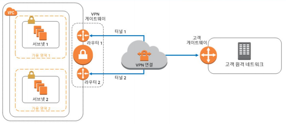 - 각 VPN 연결은 두개의 터널로 구성되며, 각 터널은 고유한 가상 프라이빗 게이트웨이 퍼블릭 IP 주소 사용