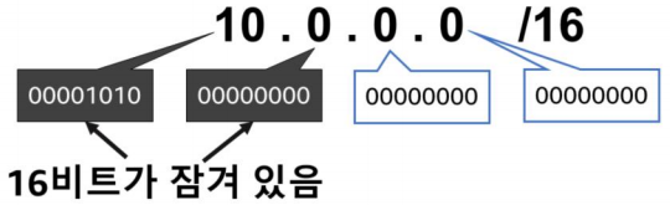 CIDR 표기법 예에 있는 16은 이러한 비트 중 몇 개가 잠겨 있고 변경할 수 없는 지 나타냄.