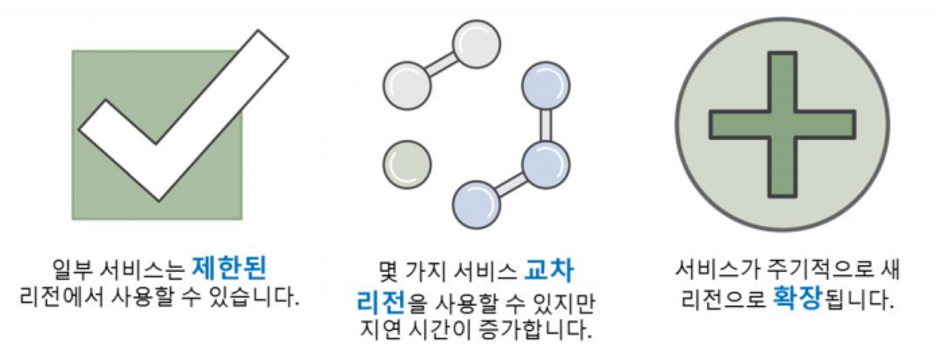 AWS에서는 서비스를 모든 리전에서 제공할 수 있을 때까지 기다렸다가 출시하지 않고, 서비스가 준비되면 먼저 릴리스하고 가능한 빠르게 제공 리전 확장