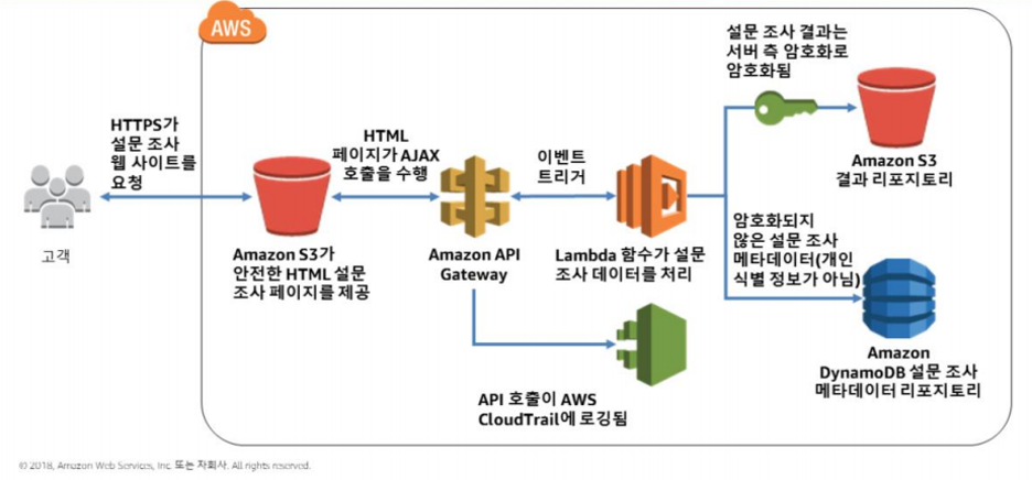 이 예에서는 서버리스 아키텍처가 안전한 설문 조사를 제공, 전송 및 처리하며, 모든 작업이 관리형 서비스에서 수행됨