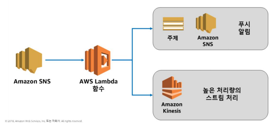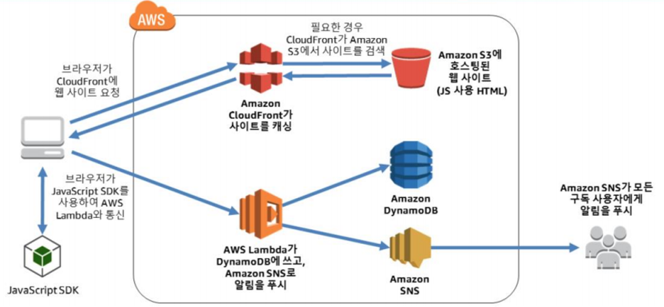 - AWS Lambda 함수는 DynamoDB 테이블에 쓰고 Amazon SNS 주제로 알림을 푸시