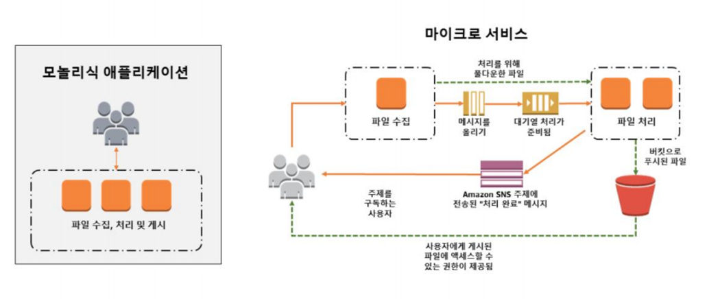 ㅁ 애플리케이션의 작업 대부분 또는 전부가 아키텍처의 같은 부분 안에서 완료되는 모놀리식 애플리케이션을 가져와 이 작업 중 일부를 서로 독립적으로 운영되는 개별 “단위”로 분산 시킴