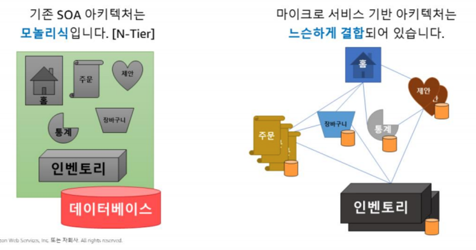 - 기존 애플리케이션 아키텍처는 모닐리식으로 시스템의 모든 구성 요소가 함께 밀결합 됨