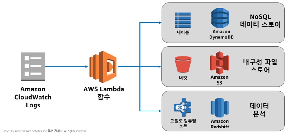 이 예에서는 서버리스 아키텍처가 다양한 용도로 로그를 처리