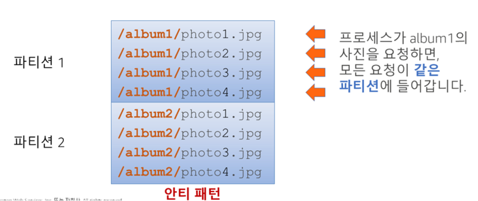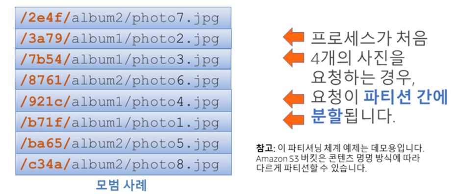 - Amazon S3 버킷에 저장된 객체가 수천 개 초과 시 Amazon S3가 버킷을 파티션 할 때 이런 파일 이름이 성능 저하 가능