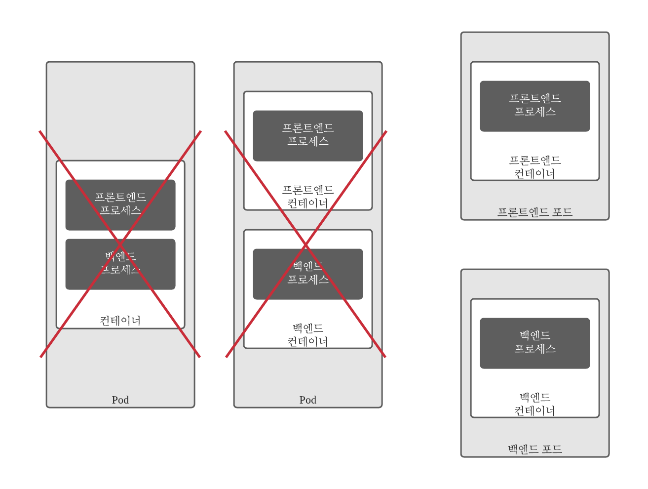 - 두개의 컨테이너가 있는 단일 Pod에서 프론트엔드 서버와 데이터베이스가 모두 실행 되는 것을 막을 수는 없지만, 좋은 방법은 아니다.