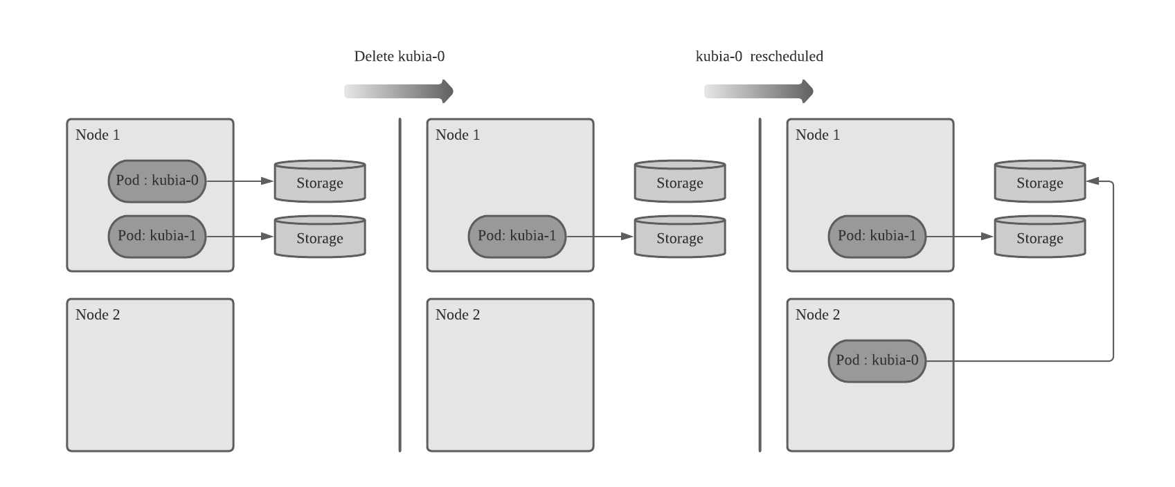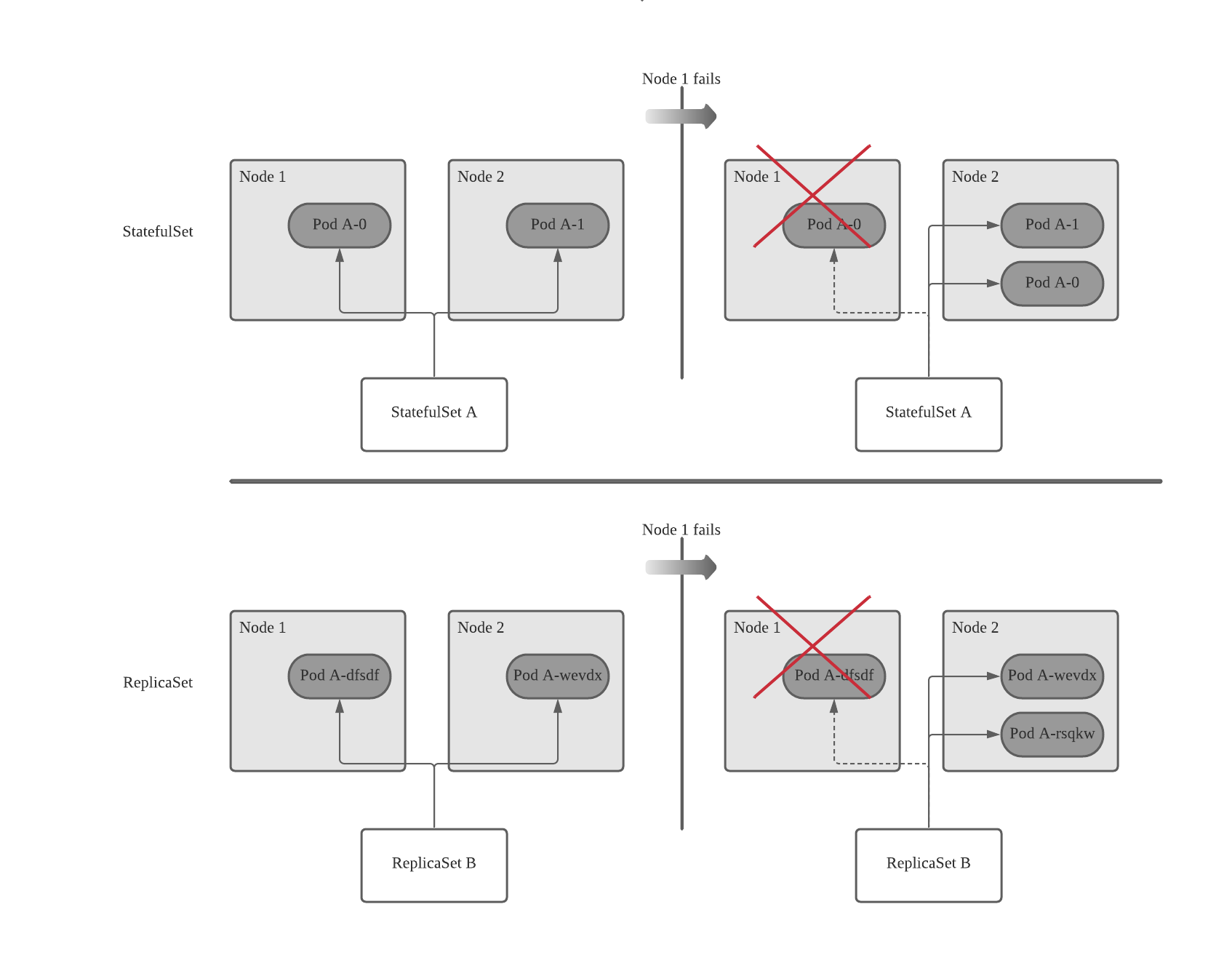스테이트풀 포드는 실행중인 노드의 장애가 발생하면 다른 노드에서 포드 인스턴스를 부활시켜야 하지만 새 인스턴스는 교체되는 인스턴스와 동일한 이름, 네트워크 ID, 상태를 가져와야 한다.