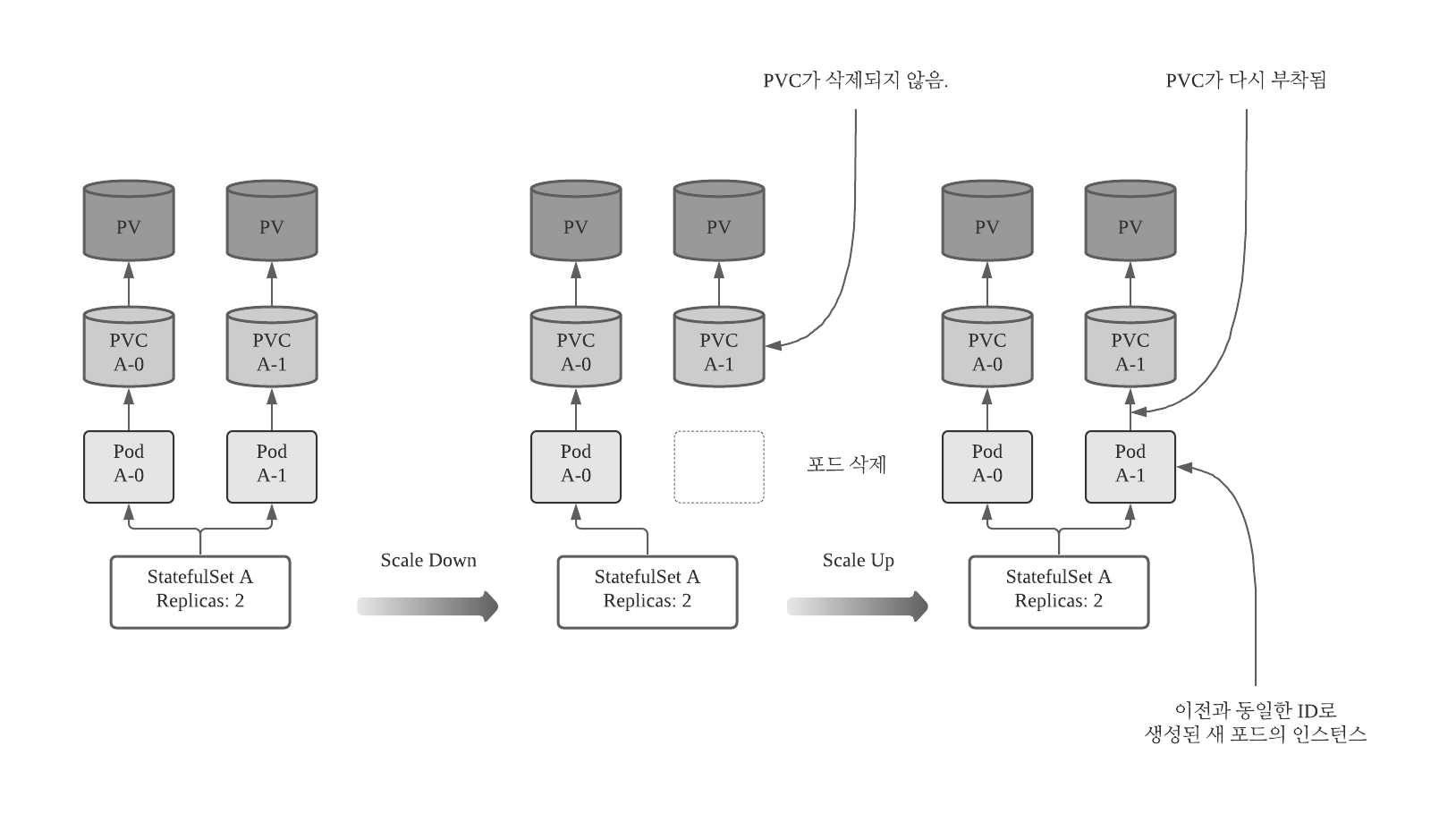 스케일 다운 이후 PVC가 남아 있다는 것은 이후의 스케일업이 바인딩된 PersistentVolume 및 그 내용을 새 포드 인스턴스에 다시 첨부할 수 있다는 의미이다.